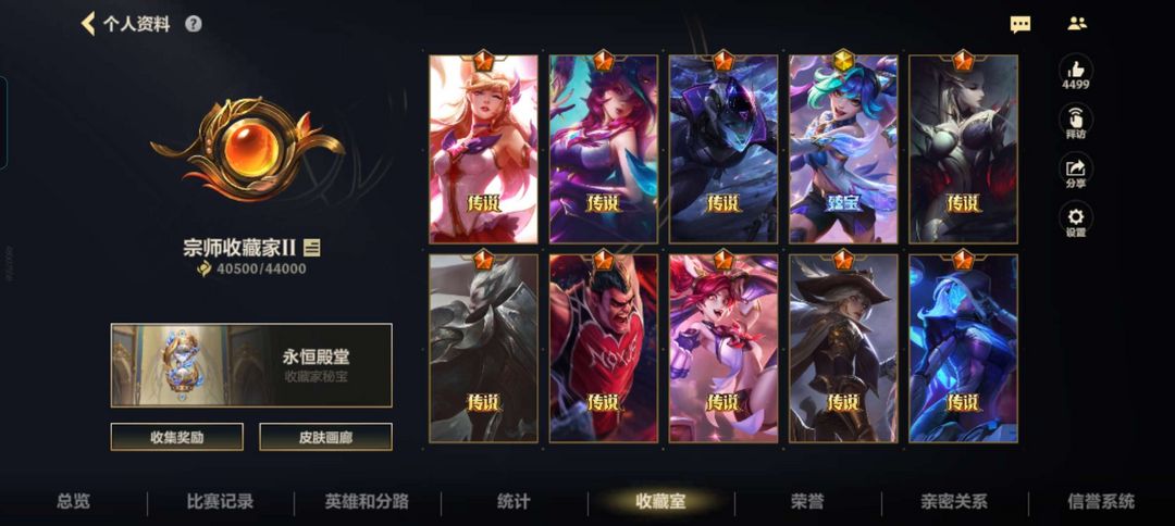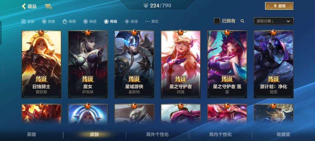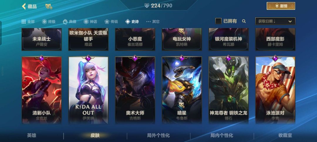 224个皮肤,80个史诗皮肤,16个传说皮肤,可打排位,5级信誉分。