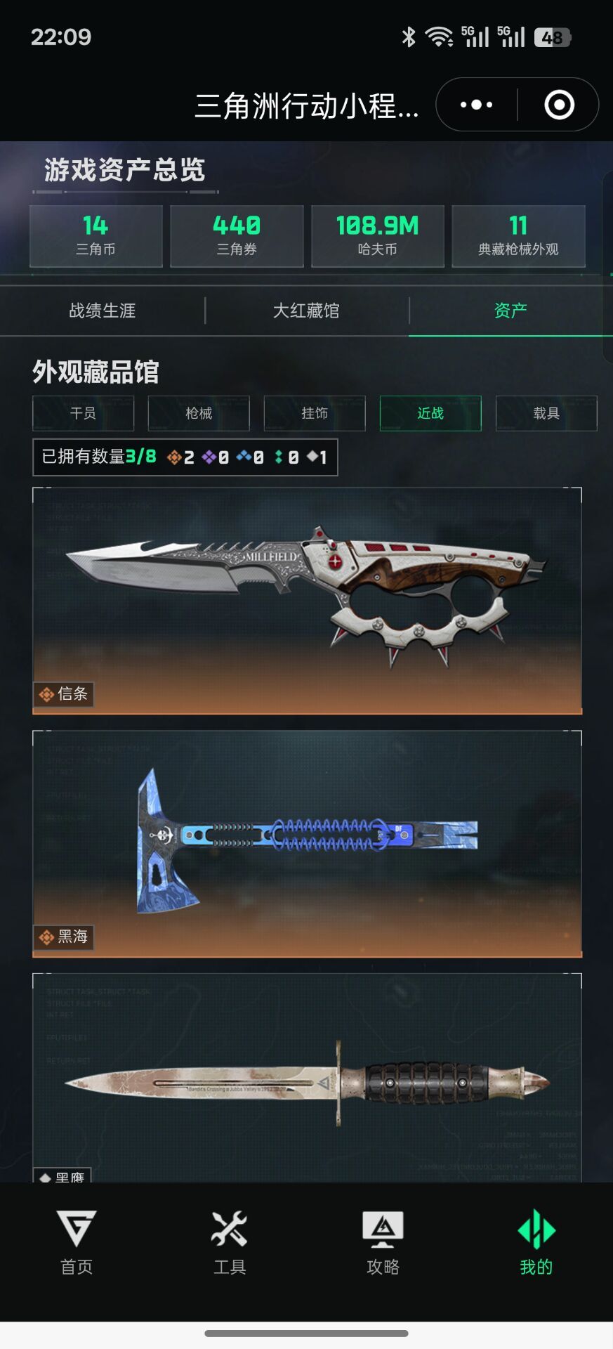 皮肤号 信条黑海刀皮,蚀金玫瑰红狼,黑天际线露娜,水墨云图,纵横捆绑包,212个枪械皮肤。