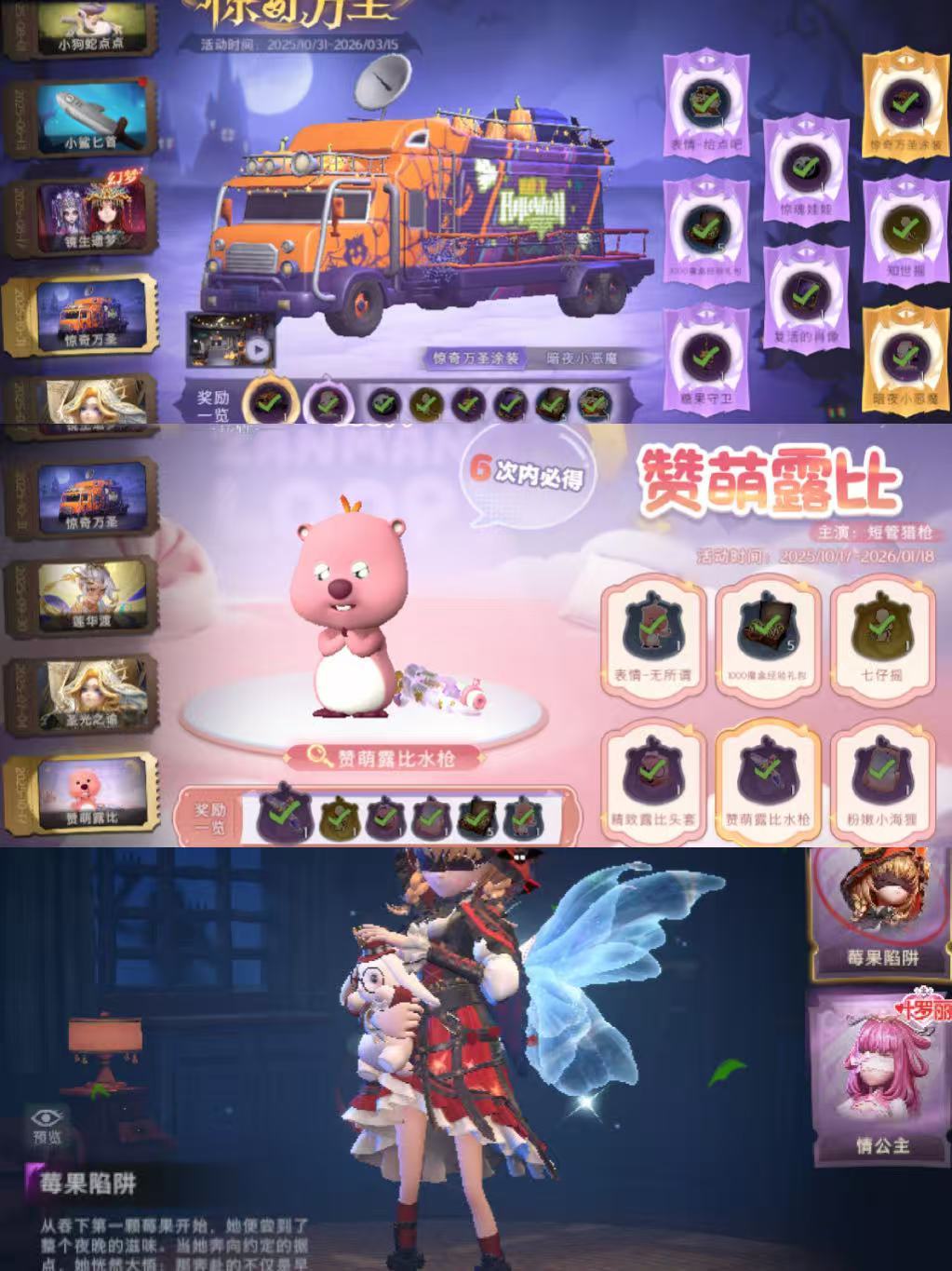 限制: 撤单率<50%才可租用此帐号装备描述:租号需要金币看个性签名,因金币撤单拉黑。【幻梦皮肤数量】1 【金色皮肤数量】6 【紫色皮肤数量】27 【道具皮肤数量】66 【赛季魔盒】稀世豪华魔盒 【员工】巫铃儿、莉莉、艾伦、爱德华、兰、小黄、爱丽丝、零、阿念、逍遥、薇薇安 【幻梦皮肤】巫铃儿-镜生遗梦 【金色皮肤】零-零渡鸦公爵、逍遥-莲华渡、薇薇安-圣光之谕、爱丽丝-血色中的玛丽、小黄-遗失的童话、巫铃儿-镜花辞 【紫色皮肤】兰-千夜星谕,零-搬开山、薇薇安-仙锋小姐、爱丽丝-甜梦派对、艾伦-绒绒对决、莉莉-莓果陷阱、小黄-异色序曲、阿念-迷途僵宝、莉莉-除妖小师妹、零-赤炼将军、薇薇安-黑月挽歌、小黄-青丘一梦、阿念-王子与骑士、莉莉-情公主、艾伦-水王子、爱丽丝-冰公主、小黄-罗丽、薇薇安-白光莹、逍遥-泽引山海、阿念-灵昭鹿鸣、爱丽丝-瑞羽衔春、小黄-霓裳踏雪、零-青云逸歌、巫铃儿-素影瑶光、爱丽丝-丝缕哀歌、逍遥-绣春逍影、小黄-呱呱雨衣 【道具皮肤】喷气背包-晶澜灵翼、长鞭-飞天绫、夜视仪-金丝眼镜、传送按钮-幻宠之门、转轮手枪-新星时代、铲子-龙鳞、摸金符-花落精绝、黄牛能量饮料-珍珠芭乐莓莓、桃木剑-凤鸣九天、急救