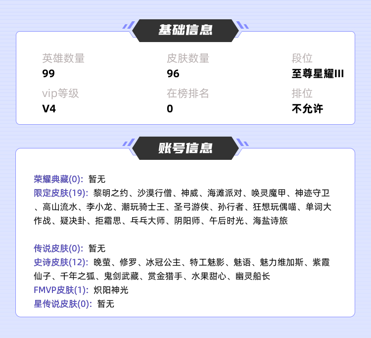 装备描述:>>>>>>毁号,涉及毁坏虚拟财产罪及计算机安全罪,请文明游戏素质游戏,让我们共建美好租号平台>>>>>> 本游戏账号: ,基础段位:至尊星耀I,英雄虽然少,应该有你喜欢的英雄。,皮肤多。FMVP皮肤1个,尽情享受FMVP皮肤带来的主角光环, 私人所属英雄皮肤有:镜 炽阳神光达摩 沙漠行僧||雅典娜 黎明之约||墨子 神迹守卫||亚瑟 潮玩骑士王||马超 神威曹操 幽灵船长||澜 赏金猎手||宫本武藏 鬼剑武藏||马可波罗 潮玩牛仔||橘右京 修罗||雅典娜 冰冠公主||不知火舞 魅语||百里守约 特工魅影||娜可露露 晚萤||妲己 魅力维加斯,等等 注意事项: A.游戏过程中请不要恶意挂机或者不文明发言;B.恶意挂机、顶号等行为将被拉黑无法再次下单;C.进入游戏后中途请勿退出登陆,否则无法再次上号;D.部分账号由于异地登录可能会出现密码错误提示,通常再尝试5-6次后可上号。 |||||||||>喜欢本账号请点 ☆收藏☆ 方便下次租用,谢谢光临惠顾|||||||||