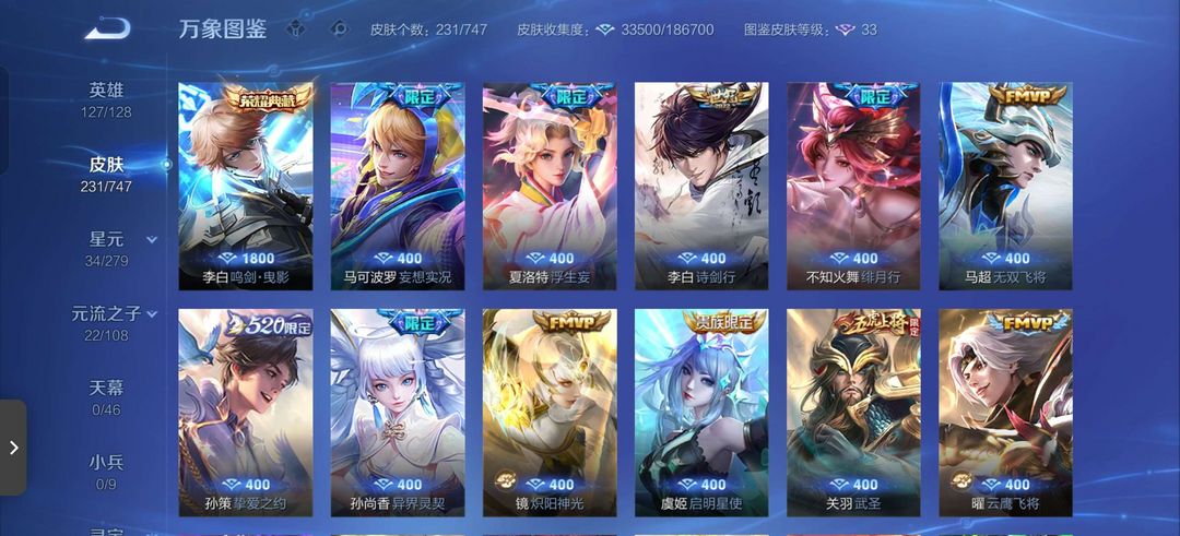 v8,231个皮肤,除武则天外全英雄,可排位可匹配鸣剑白虎志情人节限定以及其他限定和传说皮肤