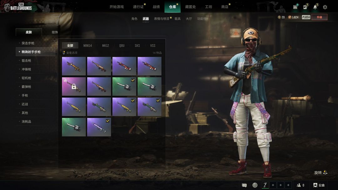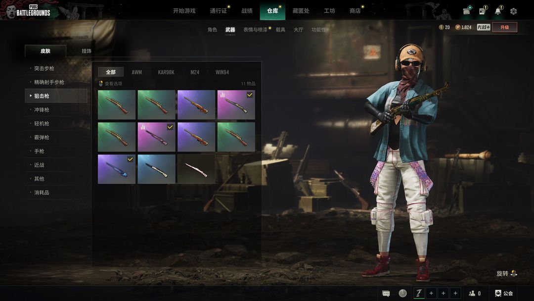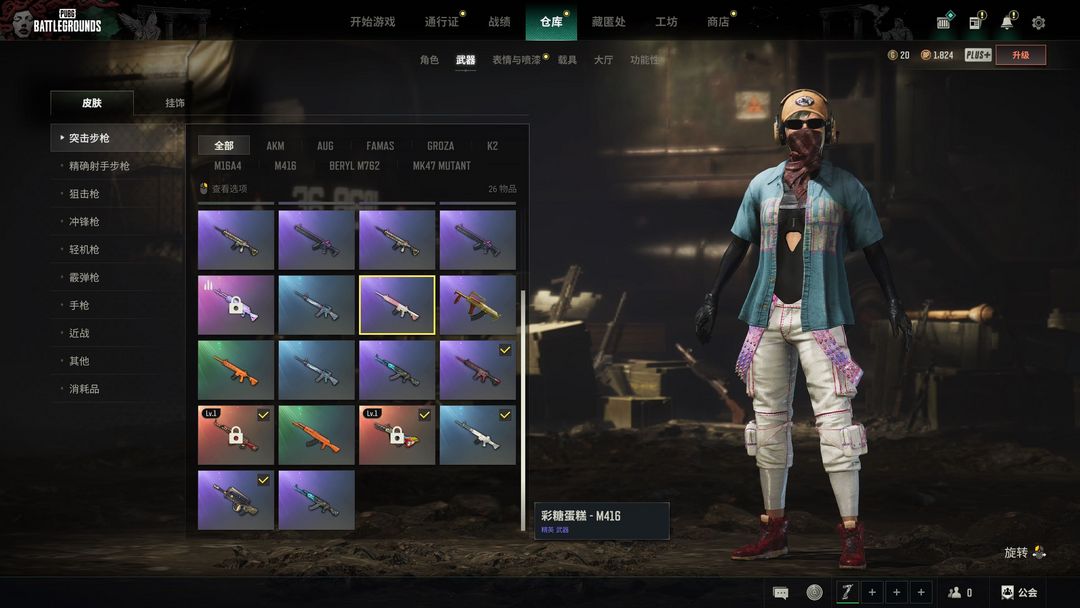 装备描述:【毁号分解报驚】圣诞ak-爆弹aug-悲喜套-危险玩偶屋BERYL M762-彩虹蛋糕m416-蒸汽sks-蒸汽98k-粉梦长眠m24-发光手臂